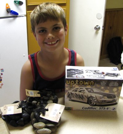 In there morning there was a ceremony where all of the children got their report cards and awards. That was the only activity so it was a very short school day and we were out of there by 9:15 a.m. We said good bye to his teacher and friends and then we went to Michael's to find some craft supplies to keep him busy for the next few days until day camp begins next Monday. After about 15 minutes of searching, Evan decided on a model car and three bags of rocks. I questioned the rock selection since we already have lots of rocks at home. He said that he thought these rocks were a lot prettier than the ones we already have. Makes sense, I guess.